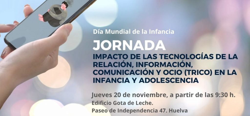 Se adjunta el cartel y enlace de inscripción de la Jornada «Impacto de las Tecnologías de la relación, información, comunicación y ocio (TRICO) en la Infancia y Adolescencia», para la mañana del 20 de noviembre, que se organiza desde la Concejalía de Servicios Sociales, Familia, Empleo, Vivienda, Desarrollo Económico y Fondos Europeos, del Ayuntamiento de Huelva, en el marco del Día Mundial de la Infancia.