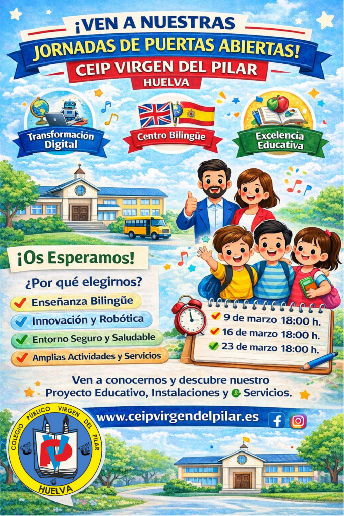 Se acerca el periodo de escolarización y sabemos que elegir el centro educativo para vuestros hijos e hijas es una de las decisiones más importantes. Por ello, desde el CEIP Virgen del Pilar de Huelva, queremos invitaros a nuestras Jornadas de Puertas Abiertas, un espacio diseñado para que podáis conocer de cerca nuestro proyecto educativo, nuestras instalaciones y al equipo humano que lo hace posible.